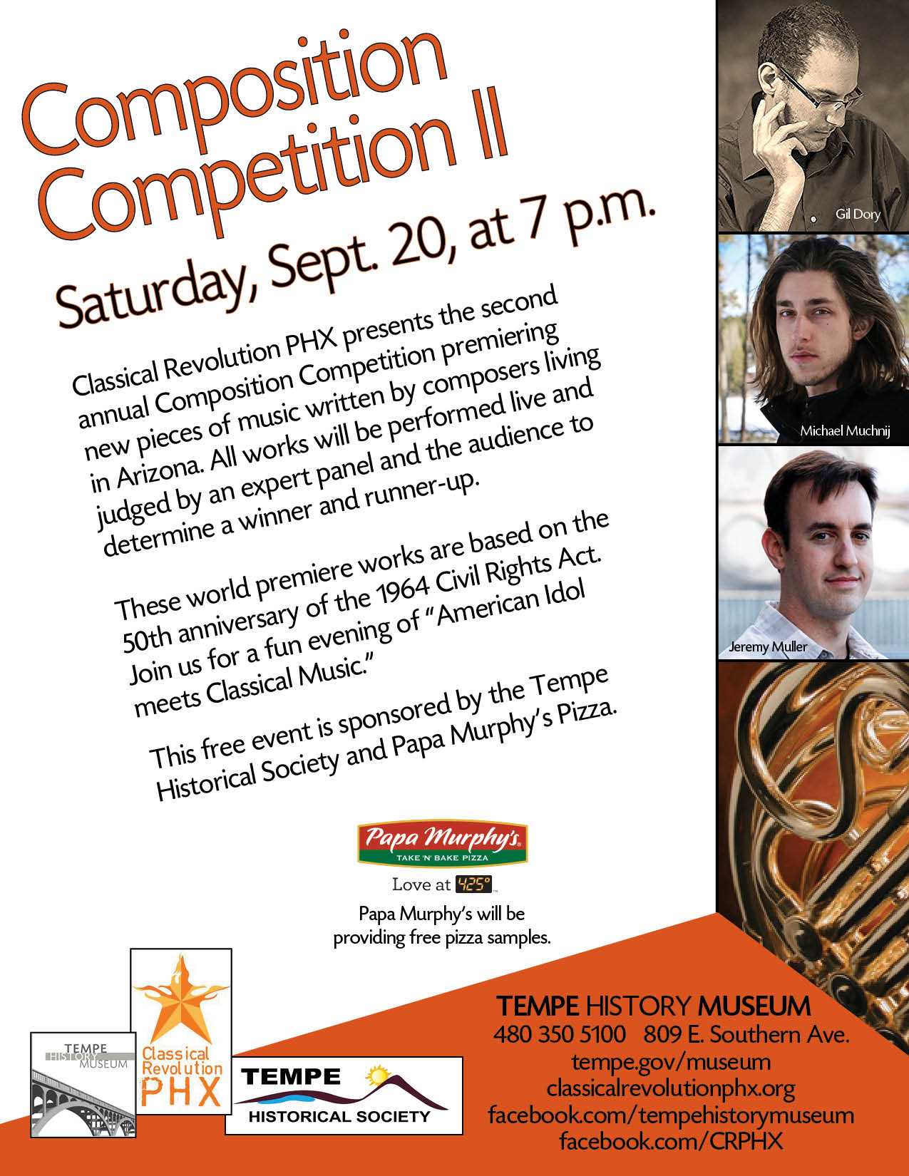 Classical Revolution PHX and Tempe History Museum invite you to an American Idol-style show complete with composers, performers, judges and even a host. The audience will listen to each of three World Premiere Performances and decide which is their favorite by voting with ballots. The judges will provide feedback and commentary throughout the concert, and choose a winner as well, giving us an Audience Pick and a Judges’ Pick for the 2014 Composition Competition II: Celebrating the 50th Anniversary of the Civil Rights Act.