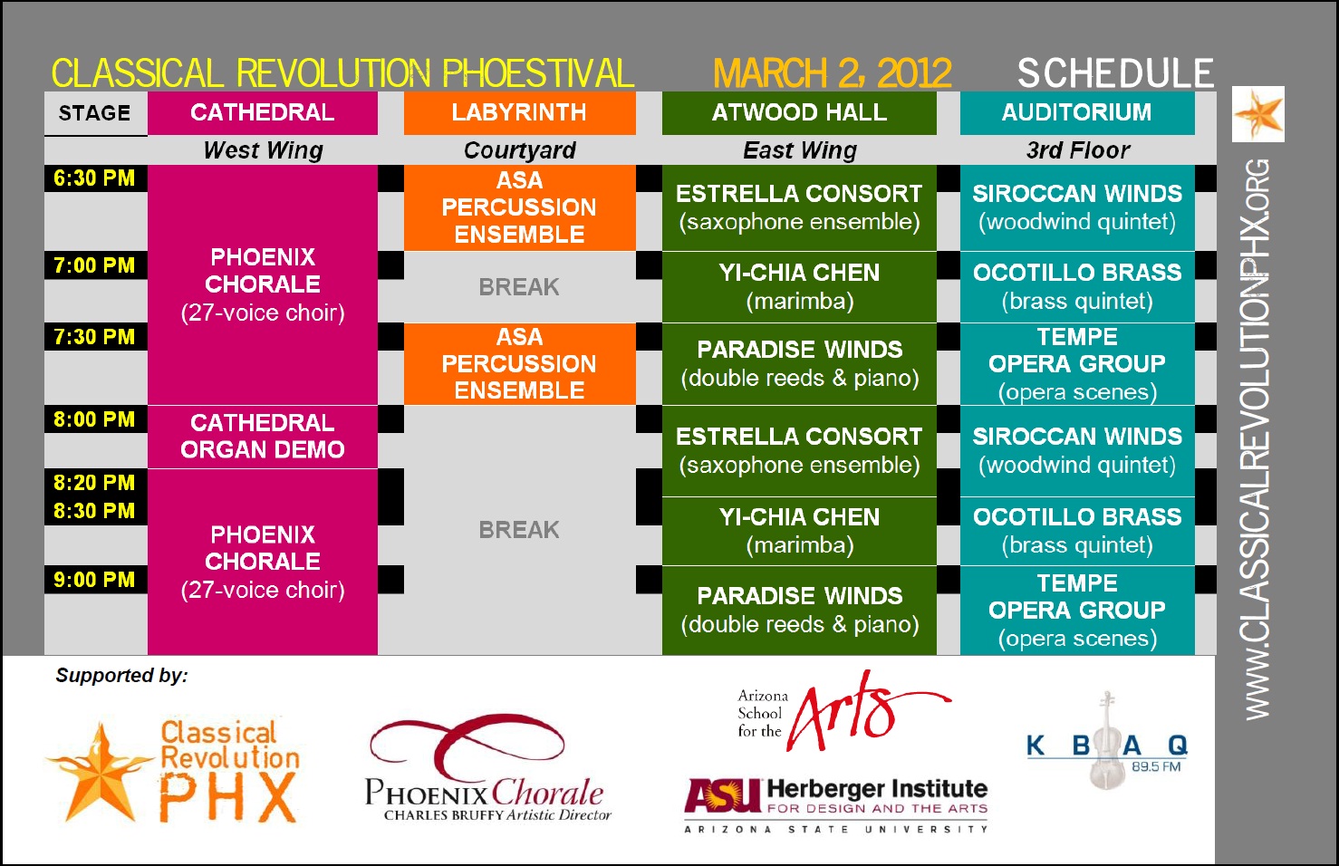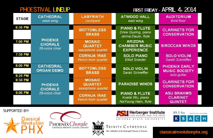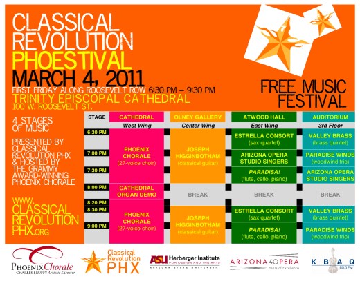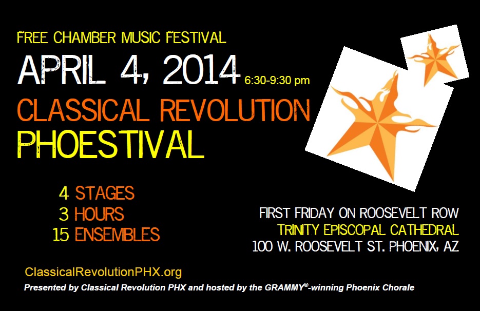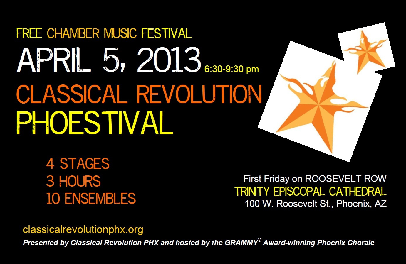 Hosted by the Grammy Award-winning Phoenix Chorale, the Classical Revolution Phoestival features multiple stages and a variety of chamber ensembles including a brass quintet, woodwind trio, classical solo guitar, vocalists, saxophone quartet, and more artists from across the Phoenix Metro area. Performers include the Phoenix Chorale, Marion Roose Pullin Arizona Opera Studio Artists, Paradise Winds, Estrella Consort, Paradisa!, Valley Brass Quintet, classical guitarist Joseph Higginbotham, a demonstration of the Great Cathedral Organ at Trinity Cathedral, and more.