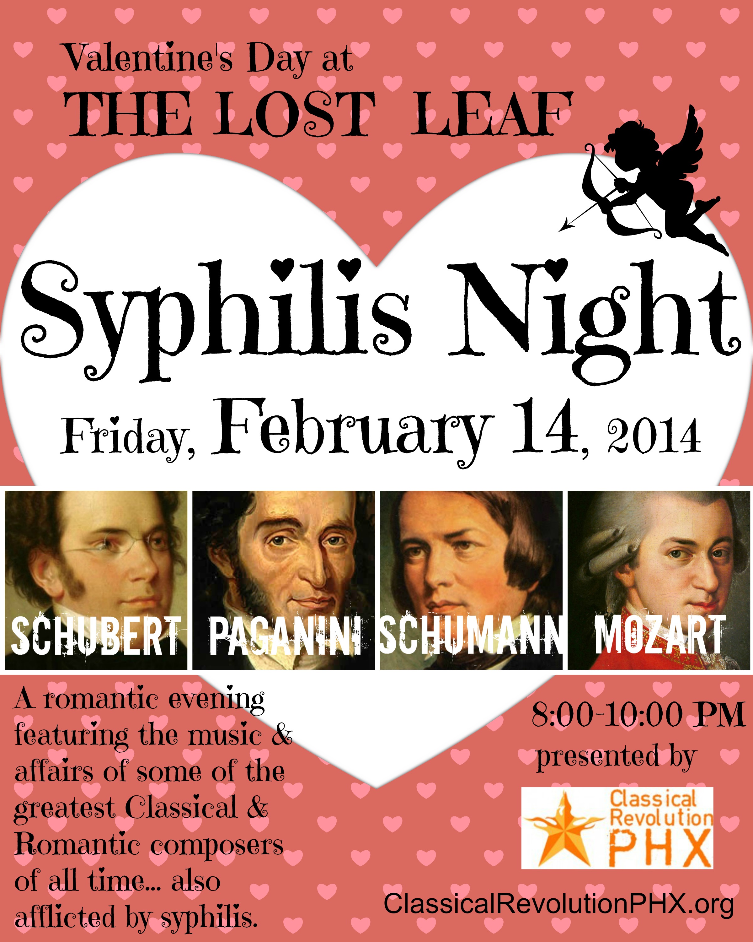 Join Classical Revolution PHX for “Syphilis Night” – music of syphilitic composers – at The Lost Leaf on 5th/Roosevelt featuring an all-star cast of local classical musicians performing Classical and Romantic works by composers whose lives were altered by the affliction of syphilis in the 18th through early 20th centuries. A casual concert all music lovers can enjoy on Valentine’s Day!
