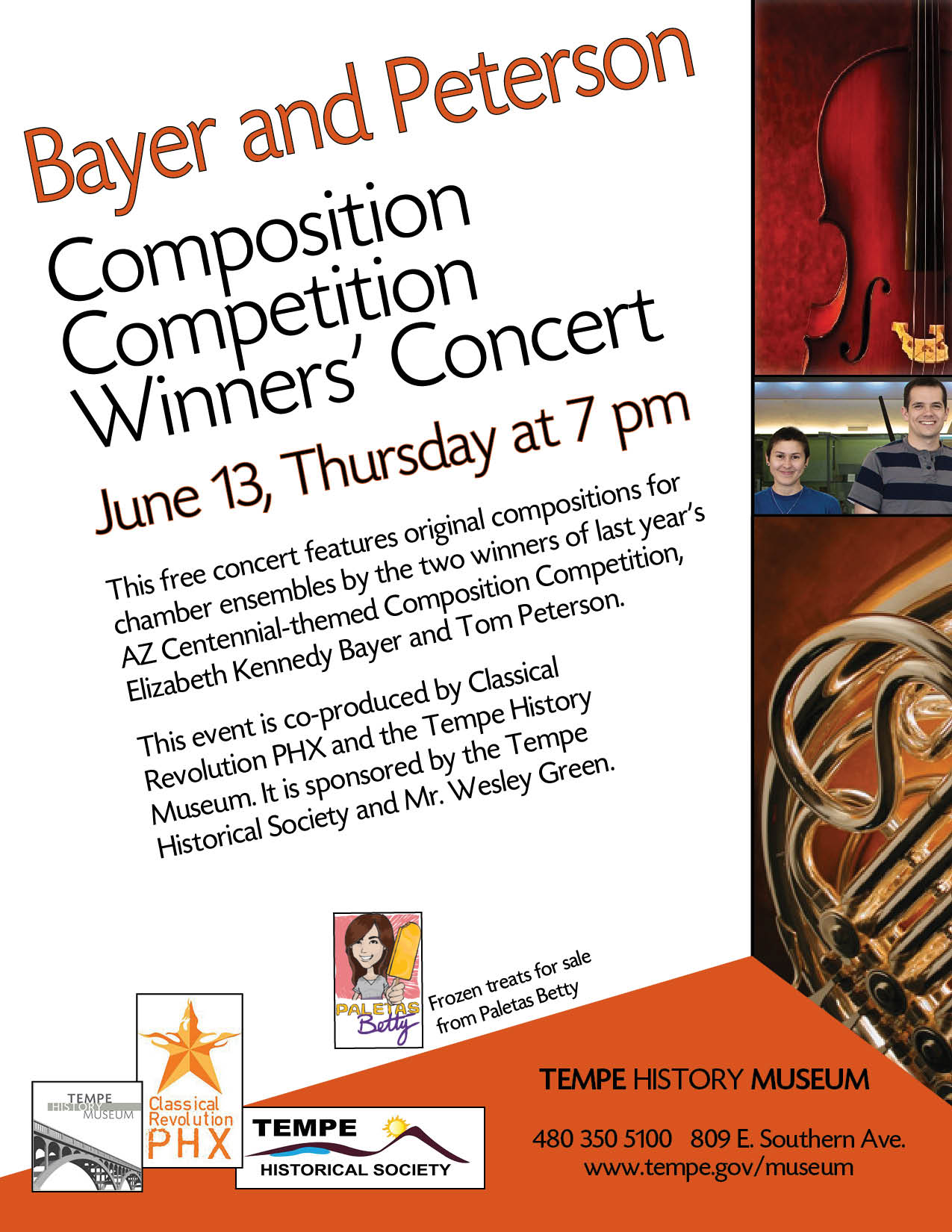 “Bayer & Peterson” is a concert of original scores for chamber ensembles and chamber orchestras with vocal soloist written by Elizabeth Kennedy Bayer and Tom Peterson, recipients of the Judges’ and Audience Awards from the 2012 Classical Revolution PHX AZ centennial-themed Composition Competition sponsored by the Tempe History Museum. “Bayer & Peterson” features woodwinds, brass, strings, harp, piano, electric guitar and digital playback and is sponsored by the Tempe Historical Society and Mr. Wesley Green. As a special summer delight, Paletas Betty will be there with ice cream treats for sale before the concert and during intermission. Join us at the Tempe History Museum (809 E. Southern Ave., Tempe, AZ 85281) for a “cool” evening of music, and be sure to check out Tom Peterson’s and Elizabeth Bayer’s web pages for more biographical information.