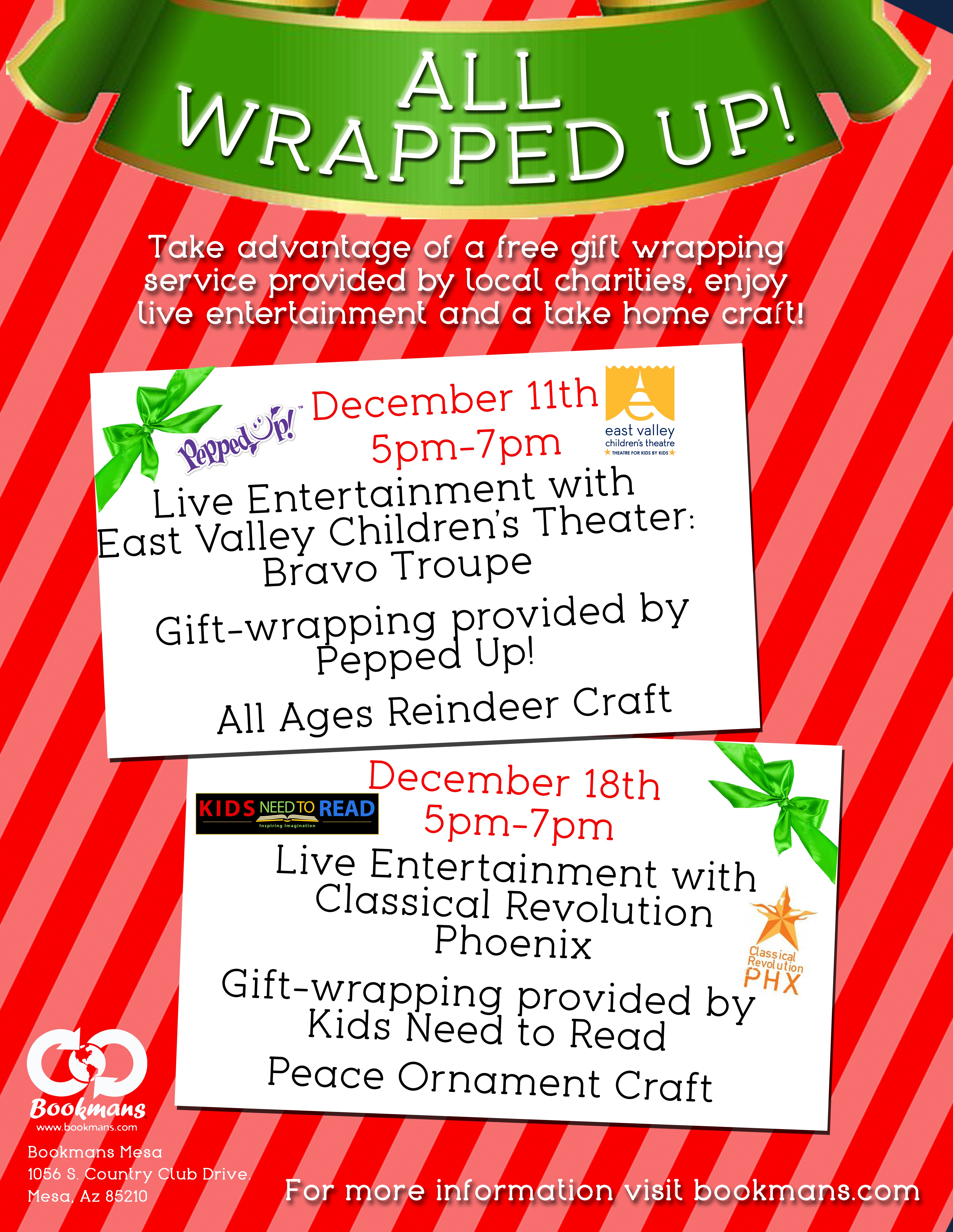 Join CRPHX at Bookmans Mesa for All Wrapped Up! Enjoy free gift-wrapping services provided by Kids in Need to Read charity and make a peace ornament to take home and put on your own tree. Classical and holiday-themed music will be provided by the Pinnacle Bassoon Quartet with Chip King, John Briggs, Joseph Kluesener, and Kate Mac Kenzie at 5:00 pm and the CRPHX String Quartet with Brittany Davidson and Emilio Vasquez (violins), Jill Osborne (viola), and Ruth Wenger (cello).
